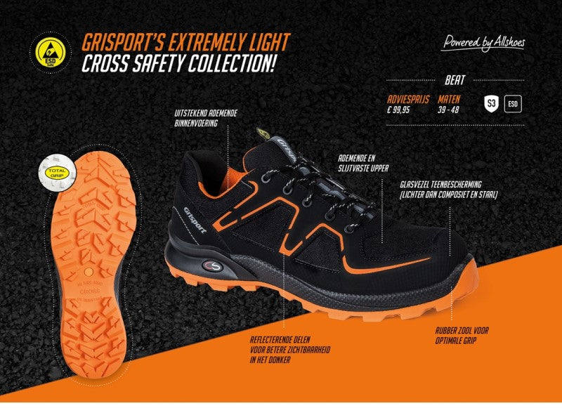 De Grisport Safety Cross Nordic / 33603 Laag S3 is een moderne en lichte veiligheidsschoen die uitblinkt in comfort en bescherming. Dankzij het lage model is de schoen bijzonder geschikt voor werkzaamheden waarbij veel wordt gelopen of bewogen, zoals in de constructie, transport en magazijnlogistiek.